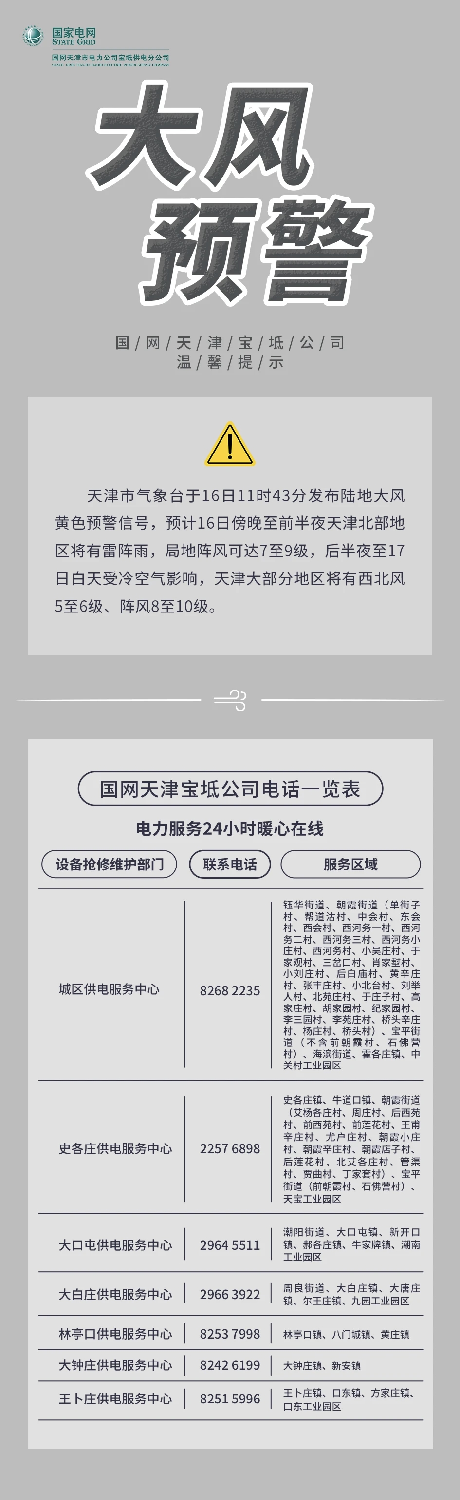 【大风预警】国网天津宝坻公司电力服务24小时暖心在线