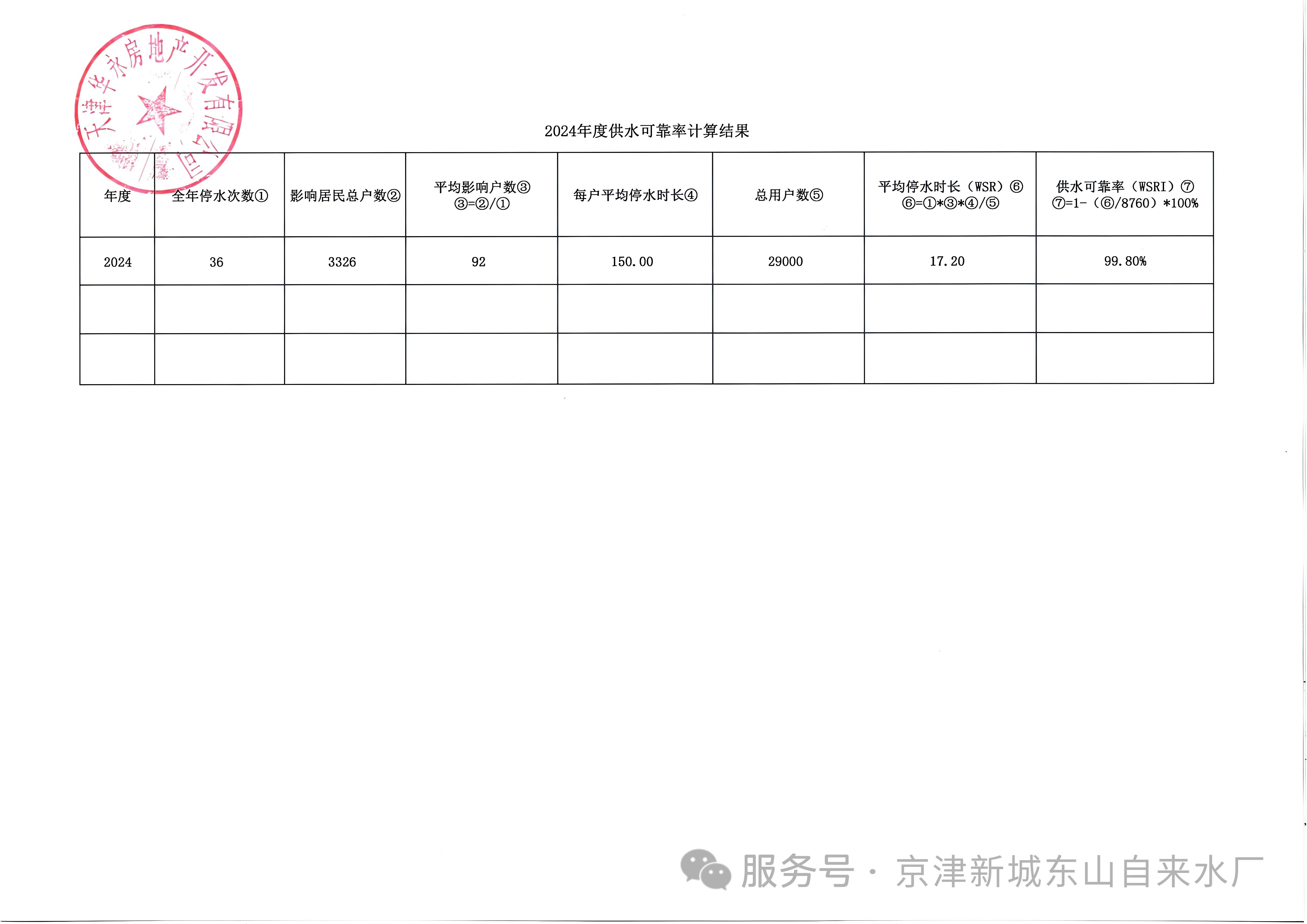 天津市华永房地产开发有限公司(东山水厂)2024年度供水可靠率公示