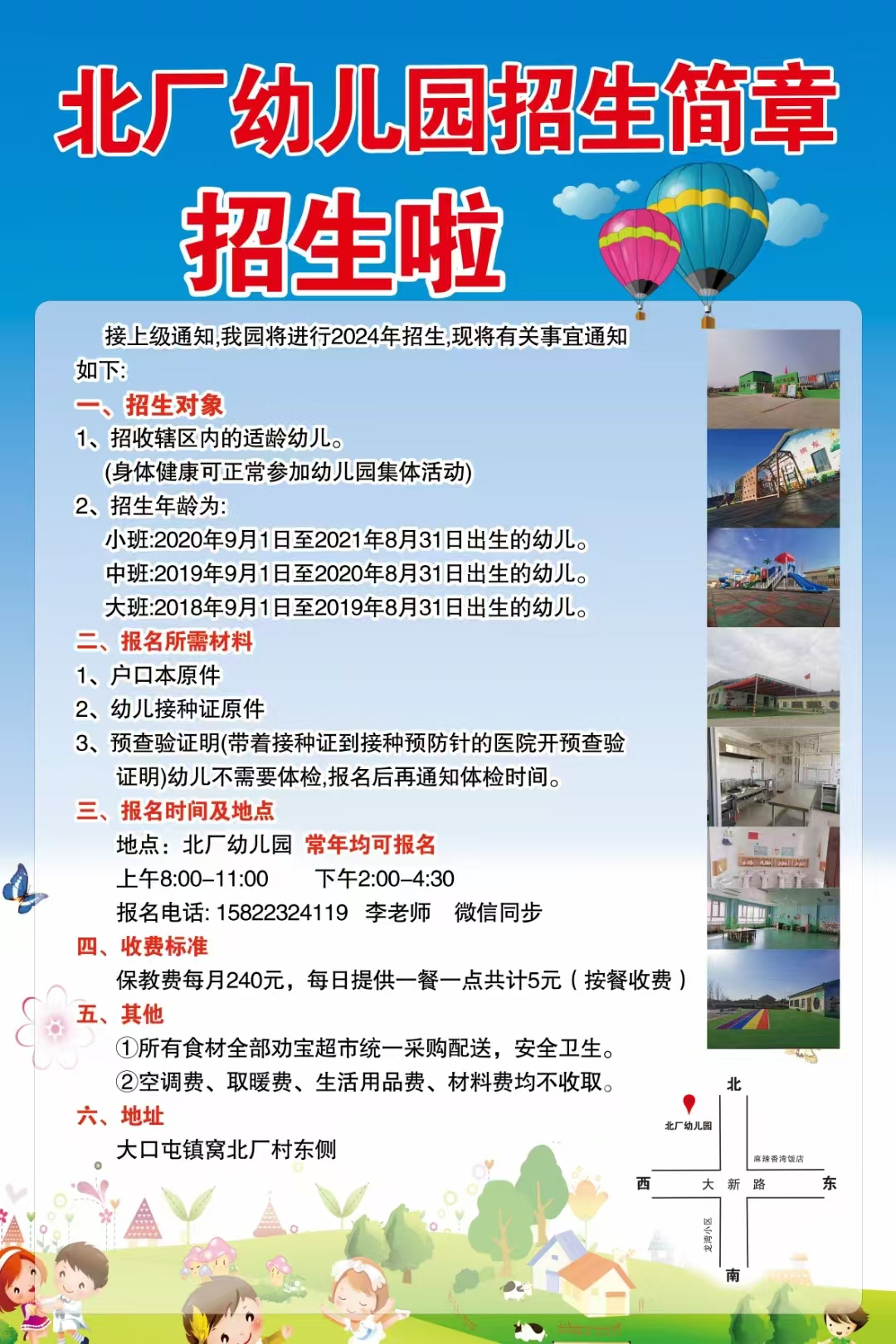 北厂幼儿园是一所农村标准园,占地8412平方米,始建于1971年名为北厂初级中学,1984年改建成北厂中心小学,2011年改建成现在的北厂幼儿园。现有幼儿47名,教职工12人,室内外设施设备齐全。北厂幼儿园一直秉承着“让孩子开心,让家长放心,让教师有信心”的办园理念。