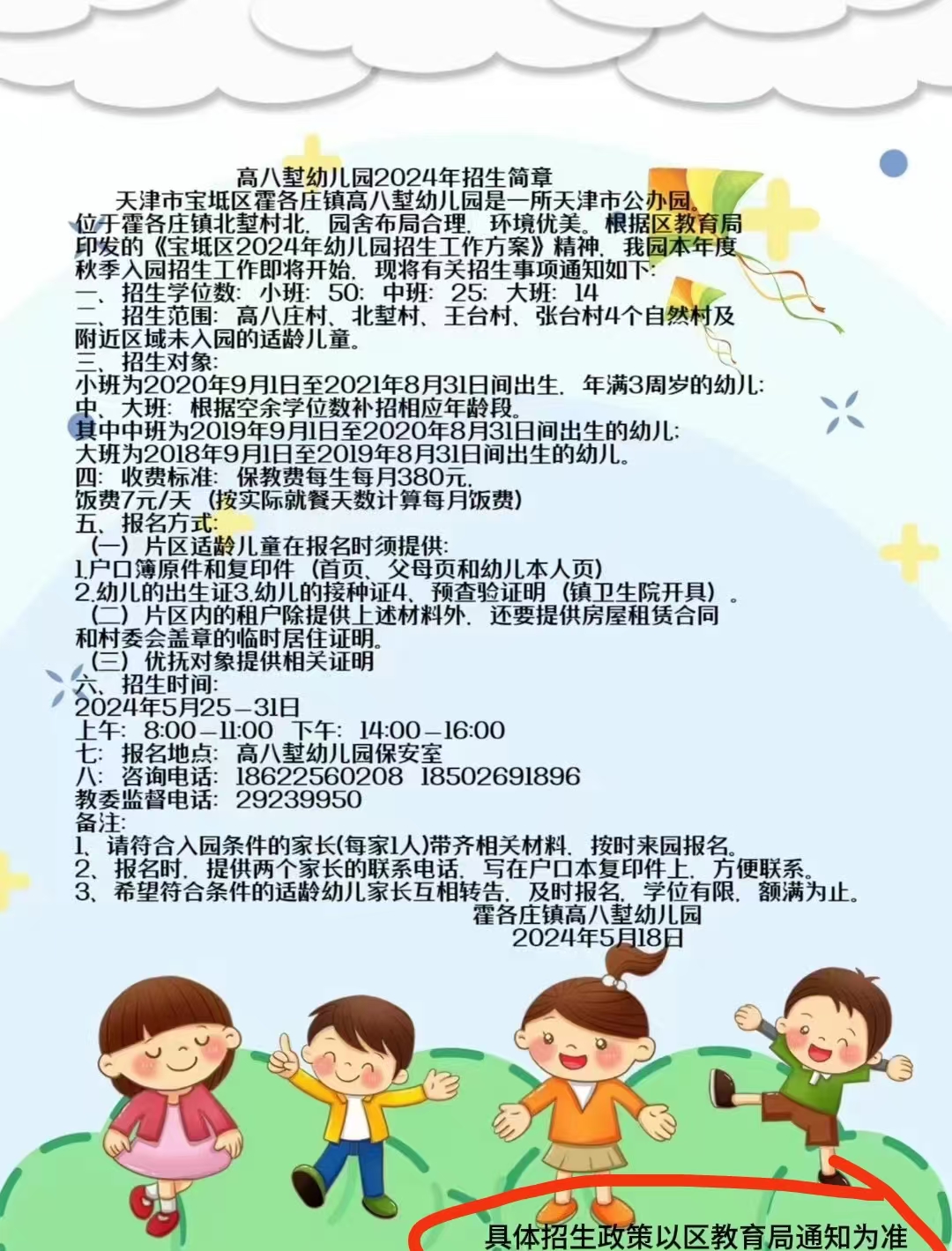 高八堼幼儿园于2000年成立,后经原地提升改建,于2021年5月1日正式投入使用。2023年9月被评定为天津市公办三级幼儿园。新园舍占地3817.63平方米,建筑总面积2300平方米,教学楼面积2176.96平方米,户外活动场地522.67平方米,绿化面积198.96平方米。我园坚持“孩子开心,家长安心,社会放心”的办园宗旨,遵循“懂礼、感恩,健康、快乐”这一办园理念,以国学教育为特色,遵循幼儿身心发展特点和规律,提高幼儿能力,让幼儿在轻松快乐的氛围中健康成长。